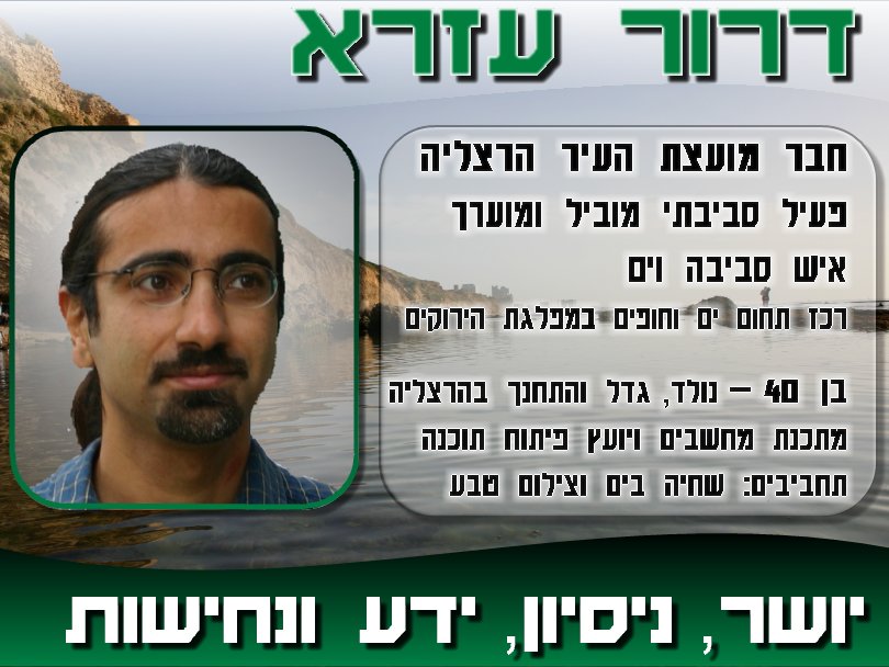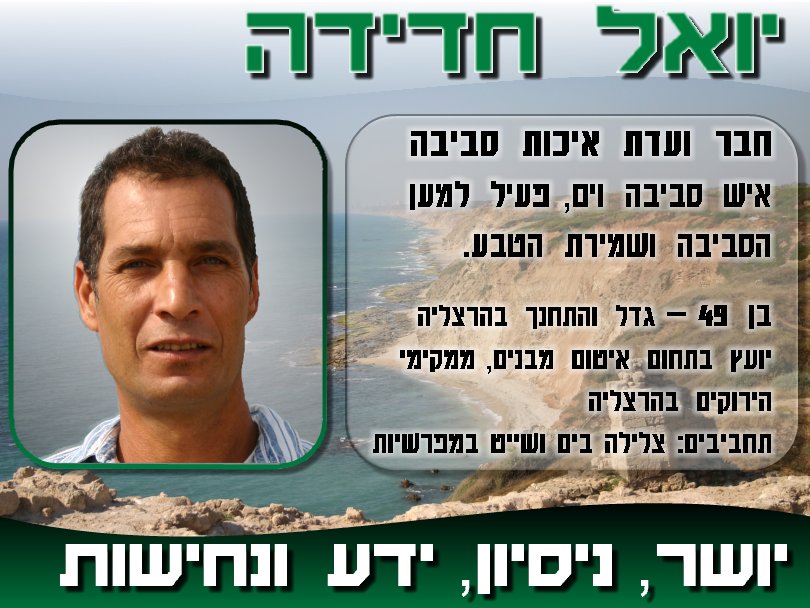 "נולדתי בהרצליה וחייתי בה כל חיי, אני ארצה לטפח את נוף-ים, ושאר השכונות, אני אקדם שמירה על שטחי הטבע בצפון נוף-ים(בזק), העירייה הוכיחה בפארק הרצליה שאפשר לעשות פארק וגם לשמור על בריכת החורף הטבעית, כך אפשר לעשות בנוף-ים לקדם את התוכנית של הירוקים לעשות פארק יחד עם שמירה על הטבע. כמו-כן ארצה לטפח את החינוך הסביבתי בעיר, יש הרבה מקום לחזק את הקשר בין הילדים לטבע ולסביבה, לטפח גינות קהילתיות ויוזמות סביבתיות."